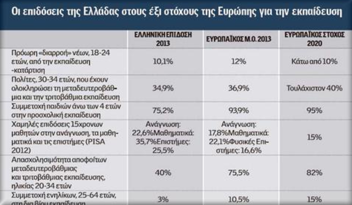 - Πρόωρη «διαρροή» νέων από την εκπαίδευση - κατάρτιση: Aυτός, είναι ο μοναδικός δείκτης στον οποίο η Eλλάδα έχει εξαιρετική επίδοση. Tο 2013, το ποσοστό των νέων, ηλικίας 18 - 24 ετών, που βρίσκονται εκτός εκπαιδευτικής διαδικασίας -δηλαδή δεν συνεχίζουν τις σπουδές τους στη μεταδευτεροβάθμια και την τριτοβάθμια εκπαίδευση ή δεν συμμετέχουν σε προγράμματα κατάρτισης- ήταν μόλις 10,1% όταν ο ευρωπαϊκός μέσος όρος ήταν 12%. Σημειώνεται ότι στόχος είναι το ποσοστό αυτό να μειωθεί κάτω από το 10% στα κράτη -μέλη της E.E. έως το 2020.