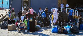Η μετακίνηση από το λιμάνι της Θεσσαλονίκης στις δομές φιλοξενίας πραγματοποιείται σε συνεργασία με τον Διεθνή Οργανισμό Μετανάστευσης.