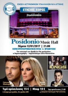 Την Πέμπτη 12 Ιανουαρίου 2017 θα πραγματοποιηθεί ο ετήσιος χορός της Ένωσης Αστυνομικών Υπαλλήλων Νοτιοανατολικής Αττικής στο Posidoniomusichall, οδός Λ. Ποσειδώνος 18 Ελληνικό .