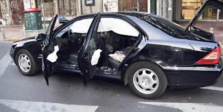 Σε άλλη φωτογραφία από το εσωτερικό της Μερσεντές, στο μπροστινό μέρος, όπου κάθονταν οι συνοδοί του, οδηγός και συνοδηγός, φαίνεται το σπασμένο παρμπρίζ, ο διαλυμένος καθρέφτης και κομμάτια του τρομοφακέλου στο καντράν, στο τιμόνι και το κάθισμα του οδηγού.