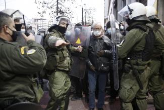 Με συνοπτικές διαδικασία η αστυνομική δύναμη που βρέθηκε στα Προπύλαια περιόρισε τους περίπου 10 που βρέθηκαν στο σημείο για να δηλώσουν την αλληλεγγύη τους στον απεργό πείνας Δημήτρη Κουφοντίνα.
