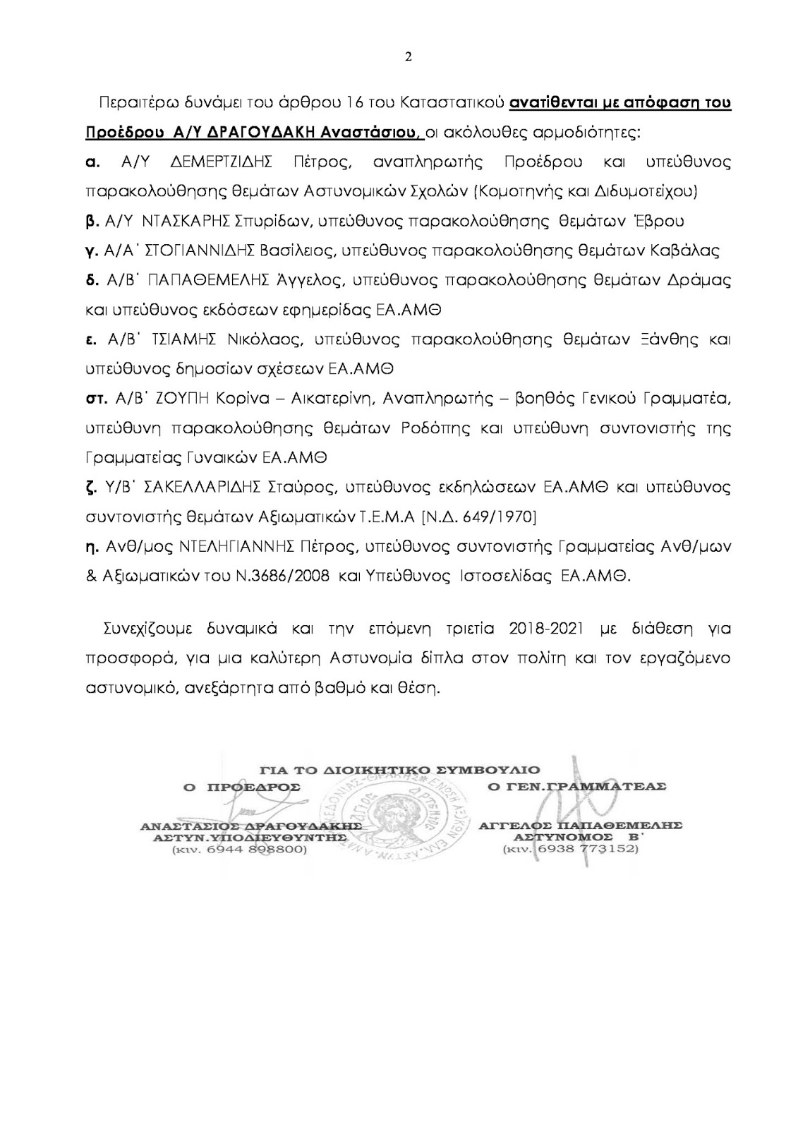 Ακολούθως μετά την συγκρότηση του Δ.Σ. σε Σώμα πραγματοποιήθηκαν δυο εθιμοτυπικές συναντήσεις , αρχικά με τον Γενικό Αστυνομικό Διευθυντή Περιφέρειας Ανατολικής Μακεδονίας - Θράκης Υποστράτηγο κ. ΜΕΝΕΞΙΔΗ Νικόλαο, όποιος μας ευχήθηκε καλή συνέχεια στο Διοικητικό Συμβούλιο που το αγκάλιασαν με τη συμμετοχή τους στις αρχαιρεσίες 400 περίπου μέλη της ΕΑ.ΑΜΘ.