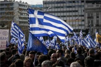 Οι ομογενείς με ελληνικές σημαίες και πλακάτ που αναφέρουν ότι η Μακεδονία είναι Ελληνική εκφράζουν την αντίθεση τους με την παραχώρηση του ονόματος της Μακεδονίας στους Σκοπιανούς.