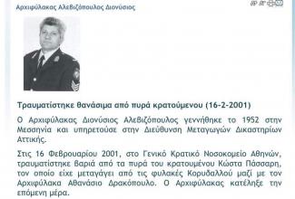 Ο Αρχιφύλακας και πατέρας του Αδάμ τραυματίστηκε θανάσιμα στις 16-02-2001 στο γενικό κρατικό νοσοκομείο Αθηνών από τα πυρά του αδίστακτου δολοφόνου Κώστα Πάσσαρη κατά την μεταγωγή του από τις φυλακές κορυδαλλού. Αθάνατος όπως και οι άλλοι συνάδελφοι μας που έχασαν την ζωή τους κατά την εκτέλεση του καθήκοντος .