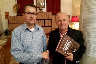 Στο πλαίσιο των εκδηλώσεων ο Γενικός Γραμματέας της Ένωσης συναντήθηκε με τον Πρόεδρο του Εργατοϋπαλληλικού Κέντρου Κυκλάδων κ. Μάρκο ΒΟΥΤΣΙΝΟ, ο οποίος τον υποδέχτηκε στην αίθουσα του Ιστορικού Αρχείου Μνήμης και Τιμής των Εργατικών Αγώνων.