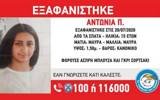 Όπως αναφέρει το δελτίο Τύπου, στις 20/07/2020 και ώρα 16:00, εξαφανίστηκε από τα Σπάτα Αττικής, η Αντωνία Π., 15 ετών.