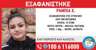 Στις 27/03/2021, εξαφανίστηκε από την περιοχή του Βοτανικού, η Ράμπια Χ. 16 ετών. «Το Χαμόγελο του Παιδιού» ενημερώθηκε σήμερα, 11/4/2021, από την οικογένεια της ανήλικης και άμεσα προέβη σε δημοσιοποίηση των στοιχείων της καθώς συντρέχουν σοβαροί λόγοι οι οποίοι θέτουν την ζωή της σε κίνδυνο. Η Ράμπια Χ. έχει ύψος 1.60 μ., είναι αδύνατη, έχει καστανά μαλλιά και μαύρα μάτια. Η Ράμπια αγνοείται τις τελευταίες τρείς εβδομάδες και η οικογένεια της ανησυχεί πολύ.