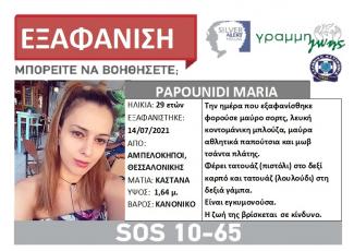 Η Papounidi Maria, 29 ετών, την 14/07/21 εξαφανίστηκε από την περιοχή των Αμπελοκήπων, στη Θεσσαλονίκη. Έχει καστανά μάτια, ύψος 1,64μ και είναι κανονικού βάρους.