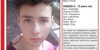 Σύμφωνα με ανακοίνωση που εξέδωσε το «Χαμόγελο του Παιδιού», πρόκειται για τον Συμεών Κ., ηλικίας 15 ετών, τα ίχνη του οποίου χάθηκαν το βράδυ του περασμένου Σαββάτου.