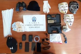Σε έρευνες στις κατοικίες των συλληφθέντων και σε οχήματα, βρέθηκαν και κατασχέθηκαν μεταξύ άλλων αεροβόλο πιστόλι με πλήθος από φυσίγγια κρότου, αμπούλες και πλαστικά σφαιρίδια, σιδερογροθιά με ενσωματωμένο μαχαίρι, σπρέι πιπεριού, ποσότητα ακατέργαστης κάνναβης συνολικού βάρους -103- γραμμαρίων, ρουχισμός, κινητά τηλέφωνα, πλήθος πλαστικών δεματικών (tie wrap) και μάσκες.