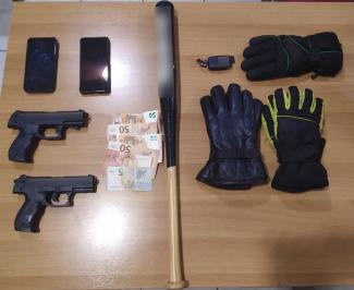 Σε έλεγχο που πραγματοποιήθηκε στο όχημα που επέβαιναν οι δράστες βρέθηκαν δύο πλαστικά πιστόλια, ένα ξύλινο μπαστούνι μπέιζμπολ, γάντια, χρηματικό ποσό και δύο κινητά τηλέφωνα, τα οποία κατασχέθηκαν.