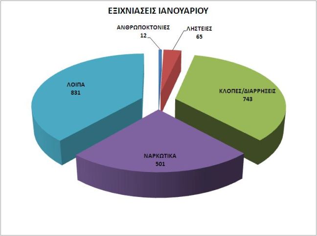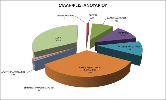 Συνολικά 8.431 άτομα συνελήφθησαν σε όλη την επικράτεια τον Ιανουάριο, έναντι 9.285 τον Δεκέμβριο του 2014, όπως προκύπτει από τα στοιχεία συλλήψεων, εξιχνιάσεων, εξαρθρώσεων και κατασχέσεων, που δημοσιεύει ανά μήνα η ΕΛ.ΑΣ.