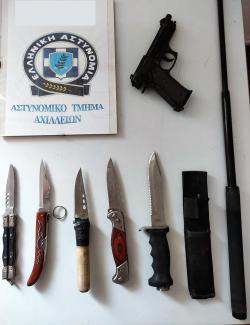 Άμεσα ο ημεδαπός εντοπίστηκε από τους αστυνομικούς και σε έρευνα που ακολούθησε στην οικία του παρουσία δικαστικού λειτουργού, βρέθηκαν και κατασχέθηκαν μία απομίμηση (ρέπλικα) πιστολιού, μία μεταλλική πτυσσόμενη ράβδος (γκλοπ), και πέντε μαχαίρια διαφόρων τύπων και διαμετρημάτων.