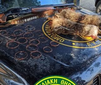 Στις 12:45 περίπου, σταμάτησαν ένα αυτοκίνητο μ’ έναν επιβαίνοντα και και στον έλεγχο που πραγματοποιήθηκε στο αυτοκίνητο, βρέθηκαν δυο λαγοί νεκροί (σκοτωμένοι με κυνηγετικό όπλο), ένας λαγός ζωντανός και 18 συρματοπαγίδες (τέλια).
