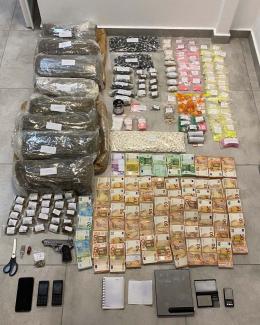 Στην κατοχή του 37χρονου και κατόπιν έρευνας τόσο σε όχημα που χρησιμοποιούσε όσο και σε δύο σπίτια στη Μύκονο όπου διέμενε, βρέθηκαν και κατασχέθηκαν: μισό κιλό κοκαΐνης, 432 γραμμάρια MDMA, 8,5 κιλά ακατέργαστης κάνναβης, 2,2 κιλά κατεργασμένης κάνναβης, 166 γραμμάρια κεταμίνης, 61 γραμμάρια tucibi, περίπου 1.400 ναρκωτικά δισκία ecstacy, 62,1 γραμμάρια τρίμματος ναρκωτικού δισκίου, πιστόλι, γεμιστήρας με φυσίγγια, ηλεκτρονικές ζυγαριές ακριβείας, δοσομετρητές και το ποσό των 180.100 ευρώ, σχετιζόμενο με εμπορία ναρκωτικών ουσιών.