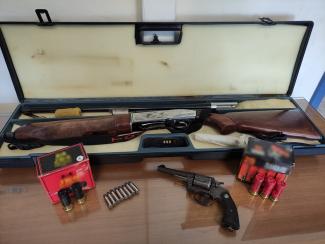 Κατά τη διάρκεια της έρευνας βρέθηκαν και κατασχέθηκαν περίστροφο, κυνηγετικό όπλο και φυσιγγια.