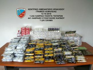 Από το Κεντρικό Λιμεναρχείο Ηρακλείου που διενεργεί την προανάκριση, κατασχέθηκαν συνολικά χίλια διακόσια σαράντα δύο (1.242) πακέτα τσιγάρων, τετρακόσιες σαράντα μία (441) συσκευασίες καπνού των 50 γραμ. η κάθε μία , το δίκυκλο όχημα, ενώ κατόπιν ενημέρωσης από το Τελωνείο Ηρακλείου το ύψος των διαφυγόντων φόρων και δασμών ανέρχεται στο ποσό των 10.505,24 ευρώ.