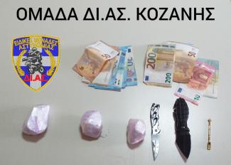 Σε έρευνα που πραγματοποιήθηκε από αστυνομικούς του Τμήματος Ασφάλειας Κοζάνης και της ανωτέρω Ομάδας ΔΙ.ΑΣ στην οικία του 30χρονου στην Κοζάνη, βρέθηκαν συνολικά και κατασχέθηκαν -2- μαχαίρια με μήκος λάμας -6- και -7- εκατοστών, αντίστοιχα, το χρηματικό ποσό των -300- ευρώ, δοχείο με υπολείμματα κάνναβης και μεταλλικό εξάρτημα χρήσης κοκαΐνης.