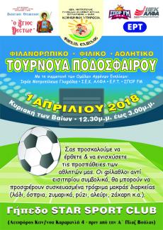 Ειδικότερα, για την ενίσχυση του πολυσήμαντου κοινωνικού έργου της Ιεράς Μητρόπολης Γλυφάδας, Ελληνικού, Βάρης, Βούλας, Βουλιαγμένης και της Κοινωνικής Υπηρεσίας «Φωλιά Ελπίδας», ο Εκπαιδευτικός Φορέας ΙΕΚ ΑΛΦΑ, η ΕΡΤ και ο ΣΠΟΡ FM συνδιοργανώνουν σπουδαίο Φιλανθρωπικό Τουρνουά Ποδοσφαίρου, το οποίο θα διεξαχθεί την Κυριακή 01 Απριλίου και ώρα 12:00 το μεσημέρι, στις εγκαταστάσεις του Star Sport Club Βούλας (Καραμανλή 4 τέρμα Τραμ Βούλας).