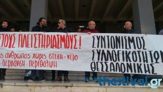 Νωρίτερα το πρωί μέλη του Συντονισμού Συλλογικοτήτων Θεσσαλονίκης ενάντια στους πλειστηριασμούς πραγματοποίησαν συγκέντρωση διαμαρτυρίας έξω από κτίριο, όπου στεγάζεται το εντευκτήριο του Συλλόγου Συμβολαιογράφων Εφετείου Θεσσαλονίκης, επί της οδού Καλαποθάκη.