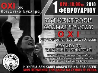Το Διοικητικό Συμβούλιο του Συλλόγου Συζύγων Θανόντων ΑΞ.Ι.Α, διαπιστώνοντας ότι δεν υπάρχει καμία σοβαρή εξέλιξη επί του θέματος των Συντάξεων Χηρείας, αποφάσισε να πραγματοποιήσει νέα Συγκέντρωση Διαμαρτυρίας έξω από το Υπουργείο Εργασίας την 1η Φεβρουαρίου 2018, ημέρα Πέμπτη και ώρα 10:00.