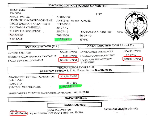 (6) Δυστυχώς όμως ο ΣΥΡΙΖΑ και οι ΑΝΕΛ επιφύλαξαν το χειρότερο σενάριο όλων για τις χήρες, και επαναϋπολογισμό και 50%, δηλαδή 452€ μικτά. [(384€/2 + 519,3€/2) Χ 70% = 903€ Χ 50% = 452€ μικτά].