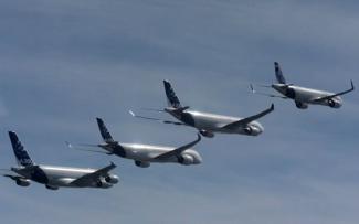 Τέσσερα από τα αεροσκάφη-τέρατα βγήκαν στους ουρανούς αυτή την εβδομάδα για μια επίδειξη της «οικογένειας» που αποτελείται από τα A380, A350, A330 και το A320neo. Σε μια απόλυτα συγχρονισμένη επίδειξη της δύναμης και του ελέγχου που έχουν, το κουαρτέτο πέταξε σε σειρά και πήρε κλίσεις σε αρμονία, όπως φαίνεται στο εντυπωσιακό υλικό που δόθηκε στη δημοσιότητα.
