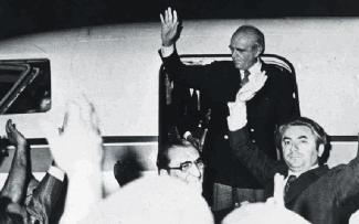 1974: Καταρρέει η δικτατορία. Αποφασίζεται ο σχηματισμός πολιτικής κυβέρνησης υπό τον Κωνσταντίνο Καραμανλή, που βρίσκεται στο Παρίσι. Ο πρόεδρος της Γαλλίας, Ζισκάρ ντ' Εσταίν τού διαθέτει το προσωπικό του αεροσκάφος για την άμεση επιστροφή του. Στο αεροδρόμιο του Ελληνικού, χιλιάδες λαού τον υποδέχονται στις 2 π.μ. Στις 4:15 π.μ. ο Κωνσταντίνος Καραμανλής ορκίζεται πρωθυπουργός μπροστά στο στρατηγό Φαίδωνα Γκιζίκη. Η μεταπολίτευση είναι γεγονός.