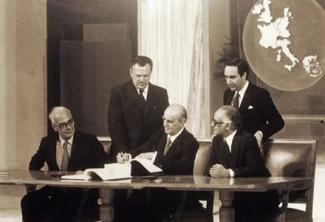 1979: Ο Κωνσταντίνος Καραμανλής υπογράφει στο Ζάππειο Μέγαρο τη συμφωνία πλήρους ένταξης της Ελλάδας στην Ευρωπαϊκή Οικονομική Κοινότητα. Οι διαπραγματεύσεις είχαν αρχίσει το 1976 και ολοκληρώθηκαν τον Μάιο του 1979. Η συμφωνία επικυρώθηκε από το ελληνικό κοινοβούλιο, ένα μήνα αργότερα, στις 28 Ιουνίου του 1979.