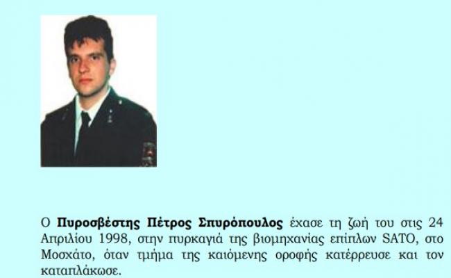 Ο Αρχιπυροσβέστης Σπυρόπουλος Πέτρος, στις 24 Απριλίου 1998 έχασε την ζωή του στο Μοσχάτο, αντιμέτωπος με τις φλόγες σε πυρκαγιά βιομηχανίας επίπλων.