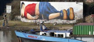 Χιλιάδες άνθρωποι που χρησιμοποιούν καθημερινά το μονοπάτι πλάι στον ποταμό Μάιν και την οδική γέφυρα θα δουν σε μια επιφάνεια 120 τετραγωνικών μέτρων την εικόνα του τρίχρονου Σύρου που πνίγηκε τον Σεπτέμβριο μαζί με τη μητέρα του και τον αδελφό του, ενώ προσπαθούσαν να φθάσουν στην Ευρώπη. Το έργο, που έχει φιλοτεχνηθεί σ' ένα σημείο που απέχει περίπου 15 λεπτά με τα πόδια από το κέντρο της πόλης, θα παραμείνει εκεί μέχρι το φθινόπωρο.