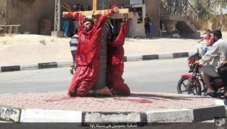 H ISIS, η σουνίτικη ισλαμιστική οργάνωση, δολοφόνησε ανθρώπους βάναυσα και ύστερα τους σταύρωσε σε δημόσιους χώρους στην πόλη Rawa στον Ευφράτη ποταμό στο Ιράκ .Η κατηγορία που τους απέδωσε ήταν κατασκοπεία.