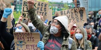 Τα πλακάτ που κρατούσαν ανέγραφαν συνθήματα όπως «Η Αστυνομία σκοτώνει» και «Δεν μπορούμε να ανασάνουμε» - τα τελευταία δηλαδή λόγια του Φλόιντ προτού ξεψυχήσει με το γόνατο του λευκού αστυνομικού καθηλωμένο στο λαιμό του.