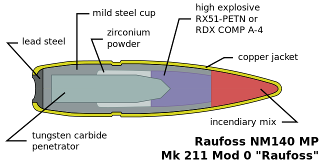 Το βλήμα έχει ένα διατρητικό (πυρήνα βολφραμίου), ένα εκρηκτικό και εμπρηστικό συστατικό, καθιστώντας το έτσι ικανό να διεισδύει σε ελαφρά θωρακισμένους στόχους, προκαλώντας ζημιές σε άτομα εντός του στόχου μετά τη διείσδυση. Είναι κατάλληλο για την εμπλοκή ακόμα και ελικοπτέρων, αεροσκαφών και ελαφρών τεθωρακισμένων οχημάτων, καθώς και αθωράκιστων οχημάτων, και είναι ικανό να προκαλέσει ανάφλεξη των καυσίμων. Το Mk 211 έχει περίπου την ίδια καταστροφική δύναμη με το πρότυπο 20 χιλιοστών φυσίγγιο εναντίον τέτοιων στόχων.