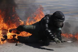 Ομως, ο νεαρός, επειδή ήταν στο έδαφος, πήρε φωτιά το παντελόνι του, ενώ φλεγόμενο υγρό ακούμπησε το δεξί πόδι του. Εβγαλα από το σακίδιό μου την αντιπυρική κουβέρτα για να σβήσω τη δική μου φωτιά, αλλά είδα το νεαρό που ήταν σε άσχημη κατάσταση και ούρλιαζε. Την ώρα που του έριχνα την κουβέρτα, ένας συνάδελφος έσβησε τη φωτιά με πυροσβεστήρα».