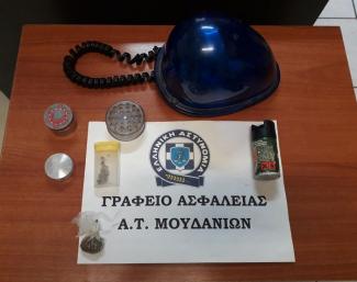 Σε έρευνα στην οικεία του βρέθηκαν και κατασχέθηκαν μικροποσότητα κατεργασμένης κάνναβης, 37 σπόροι κάνναβης, ένα σπρέι πιπεριού και ένας φάρος οχήματος.