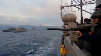 R/V “RAMFORM HYPERION” IS TOWING 14X10000 METERS CABLES AT A WIDE SPREAD OF 1500 METERS AND IS ACCOMPANIED BY GUARD VESSELS .