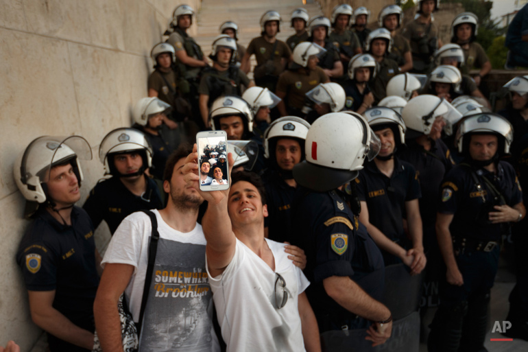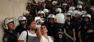 Selfie με φόντο τις δυνάμεις των ΜΑΤ έξω από τη Βουλή, κατά τη διάρκεια της διαδήλωσης υπέρ του ευρώ στις 22 Ιουνίου. Φωτογράφος: Daniel Ochoa de Olz