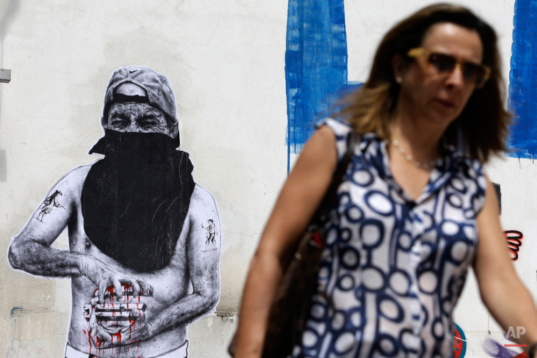 Αθήνα, 22 Ιουνίου. Στο γκράφιτι ένας διαδηλωτής συνθλίβει το ευρώ. Φωτογράφος: Θανάσης Σταυράκης