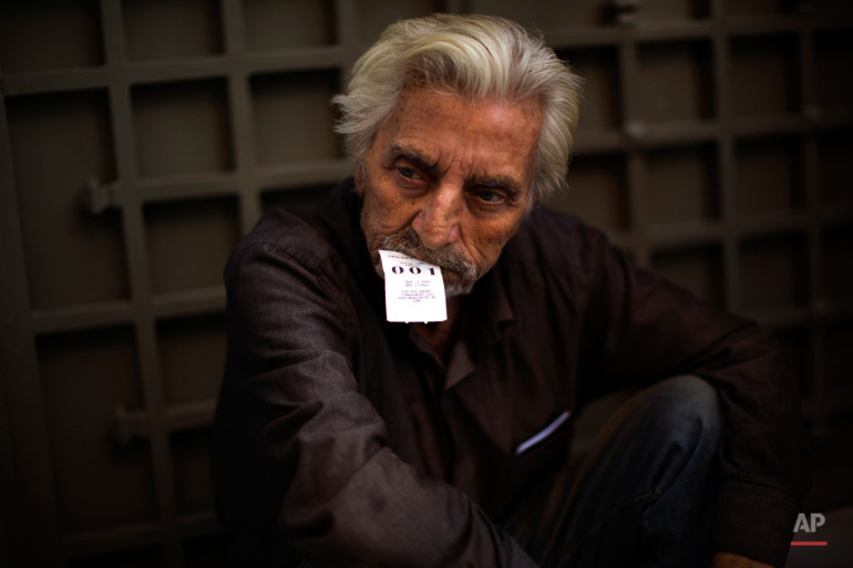 Ο 81χρονος Ιωάννης Μυταράς με το χαρτάκι προτεραιότητας στα δόντια έξω από τράπεζα στην Αθήνα. Παρασκευή, 3 Ιουλίου. Φωτογράφος: Emilio Moneratti