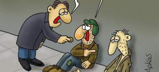 Στο νέο του σκίτσο αποτυπώνει δύο φτωχούς. Ενας κύριος τους πλησιάζει και δίνει μόνο στον έναν να φάει λέγοντάς του: «Πάρε φτωχέ μου άνθρωπε να κάνεις Χριστούγεννα».