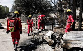 Πλησιάζοντας συναντάμε πυροσβέστες, εξαντλημένους, αλλά δυνατούς. Τους ρωτάμε αν χρειάζονται κάτι, μας κάνουν νόημα και ενήμεροι για την αποστολή μας μας αφήνουν να περάσουμε. Αυτοί είναι ήρωες, παίρνεις δύναμη βλέποντάς τους. Οδηγώντας μέσα από στενά περάσματα που δεν επιτρέπουν λάθη, φτάνουμε. Κατεβαίνουμε και φοράμε τον εξοπλισμό. Κράνη, μάσκες, γάντια… Ενα σύντομο briefing, ξεκινάμε.