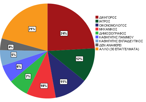 Συνολικά σχεδόν το 1/2 είναι δικηγόροι, ιατροί και οικονομολόγοι. Τα υπόλοιπα επαγγέλματα που αναφέρονται είναι:
