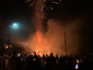 Το θέαμα είναι εντυπωσιακό καθώς οι φλόγες από τις μεγάλες φωτιές χάνονται στον ουρανό μαζί με τα πυροτεχνήματα.