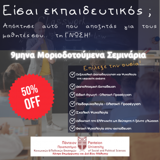Όλοι οι εκπαιδευτικοί που θα πραγματοποιήσουν την εγγραφή τους έως και τις 26 Ιουλίου, στα παρακάτω προγράμματα δικαιούνται έκπτωση στα δίδακτρα της επιμόρφωσης 50% και πρόσβαση σε όλες τιςεπιπλέον παροχές που προσφέρονται. Μάθε για αυτές στον ιστότοπο www.easy-education.grκαι https://e-learning.panteion.gr/
