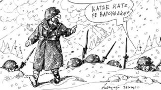 Στο σκίτσο εμφανίζεται ένας στρατιώτης στο μέτωπο της Αλβανίας να λέει: "Θα τους αποδομήσω τη λάθος γεωστρατηγική τους ανάλυση και θα τους παρουσιάσω τη μελέτη που έχω εκπονήσει για το μέλλον της περιοχής".