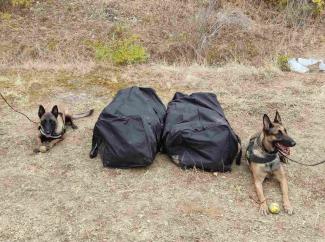 Με τη συνδρομή του αστυνομικού σκύλου «Minnie» της Διεύθυνσης Αστυνομίας Κιλκίς, αλλά και του σκύλου ανίχνευσης ναρκωτικών «Iris » του Τελωνείου Ευζώνων, πραγματοποιήθηκαν με το πρώτο φως εκτεταμένες έρευνες στην ευρύτερη περιοχή, με αποτέλεσμα να εντοπιστούν σε δασώδη περιοχή 2 σάκοι με ποσότητες κάνναβης, που είχε κρύψει ο συλληφθείς.