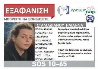 Η μητέρα της σε επικοινωνία με την εφημερίδα «Ταχυδρόμος» είχε απευθύνει έκκληση για να βρεθούν τα ίχνη της 26χρονης, που αντιμετωπίζει προβλήματα υγείας και λαμβάνει φαρμακευτική αγωγή. Σύμφωνα με τη μητέρα της 26χρονης, η Ηλιάννα βρισκόταν στο σπίτι της στον Ασωπό Λακωνίας μέχρι και την προηγούμενη Τετάρτη (14/12) το βράδυ.