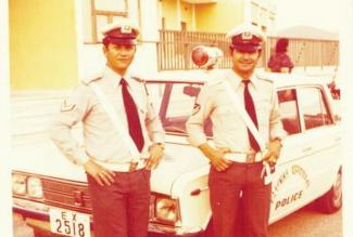 Πρόκειται για δύο τροχονόμους που φωτογραφήθηκαν έξω από το περιπολικό τους, στο πλαίσιο της καθημερινής τους εργασίας. "Καλημέρα με αναδρομή στο παρελθόν.