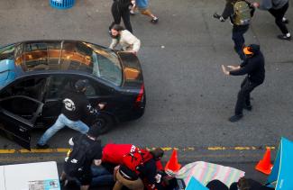 Όπως φαίνεται στις εικόνες, ο άνδρας που φοράει καπέλο τζόκεϊ, μαύρη μπλούζα και τζιν, γκαζώνει και κινείται με το αυτοκίνητό του προς την πλευρά που βρίσκονται διαδηλωτές. Π κόσμος αρχίζει να τρέχει πανικόβλητος και το αυτοκίνητο σταματά σε ένα εμπόδιο.